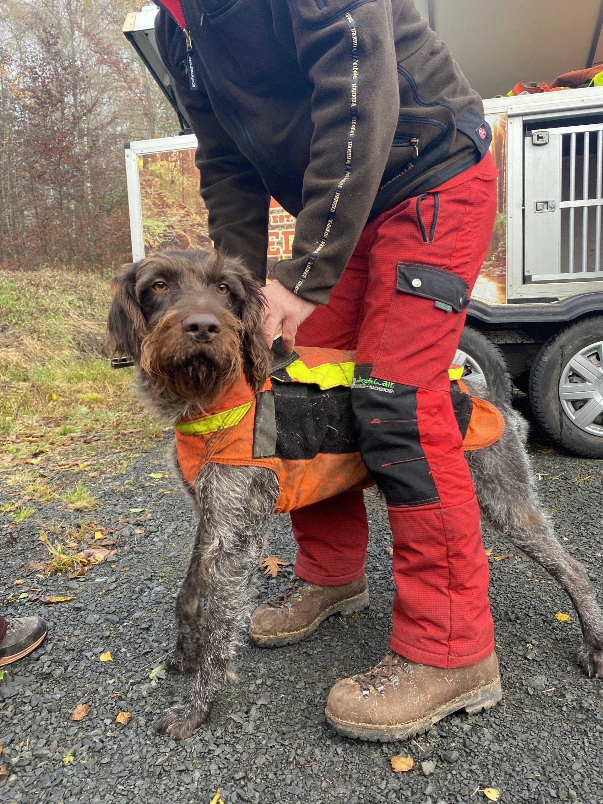 Einen Jagdhund ohne jagdliche Passion gibt es bei uns, unser Rauhaardackel "Adolf" vom Raubaard. Die Passion seiner erfolgreichen Eltern ist so komplett an ihm vorbei gegangen. Aber gut, er ist der ständige Begleiter unserer Tochter. So hat auch er eine sinnvolle Aufgabe gefunden. Da unsere Terrier leider nicht mehr da ist, begleitet uns Adolf inzwischen auch zu den Drückjagden, und was soll ich sagen, er macht sich inzwischen ganz gut. Im Herbst 2025 werden Renee und Adolf dann auch die Brauchbarkeit §7 Nachsuche auf Schalenwild absolvieren, damit dann auch der letzte Hund in der Runde brauchbar ist.