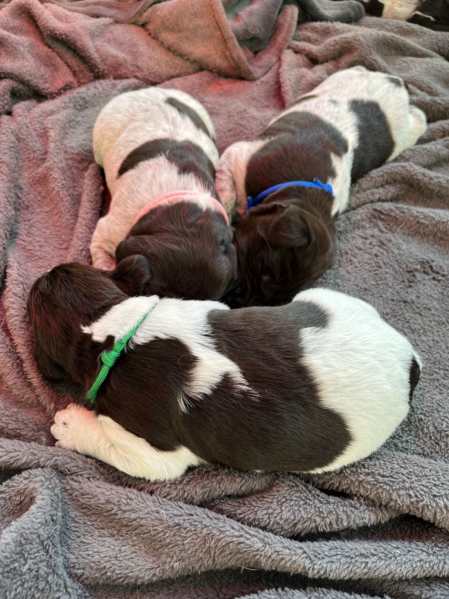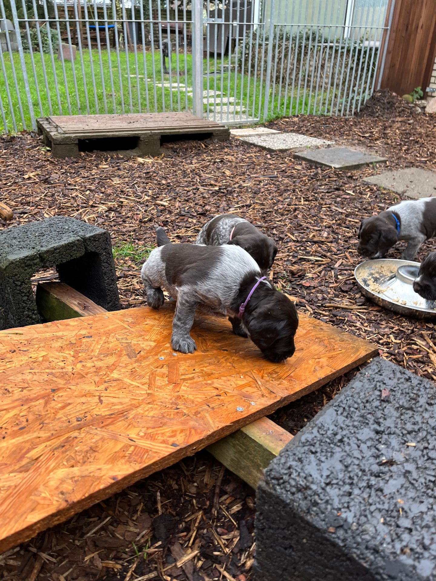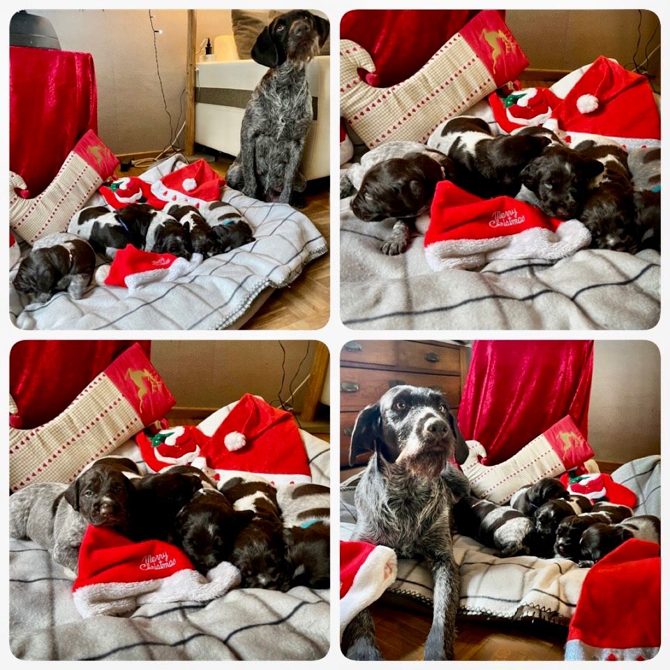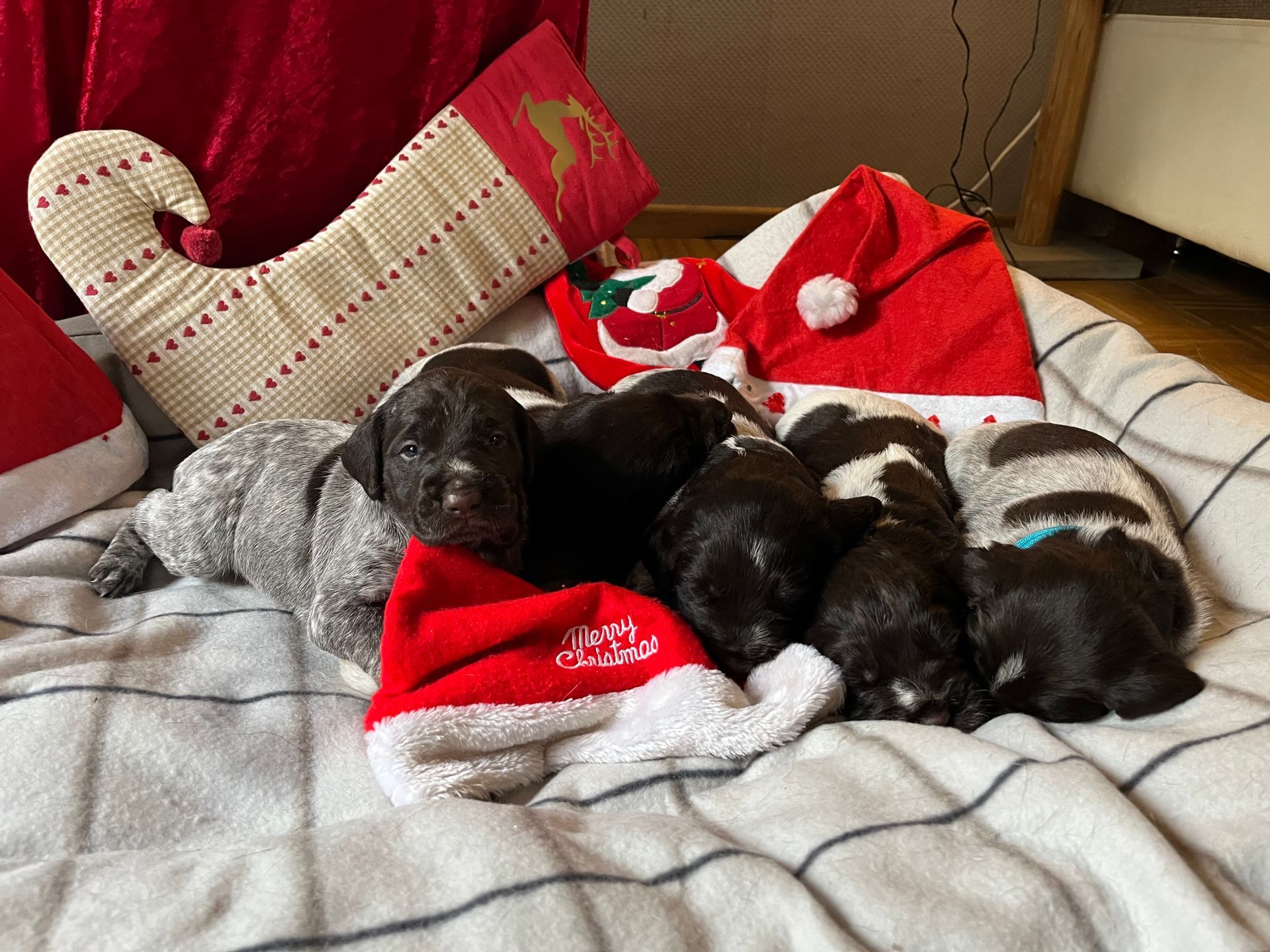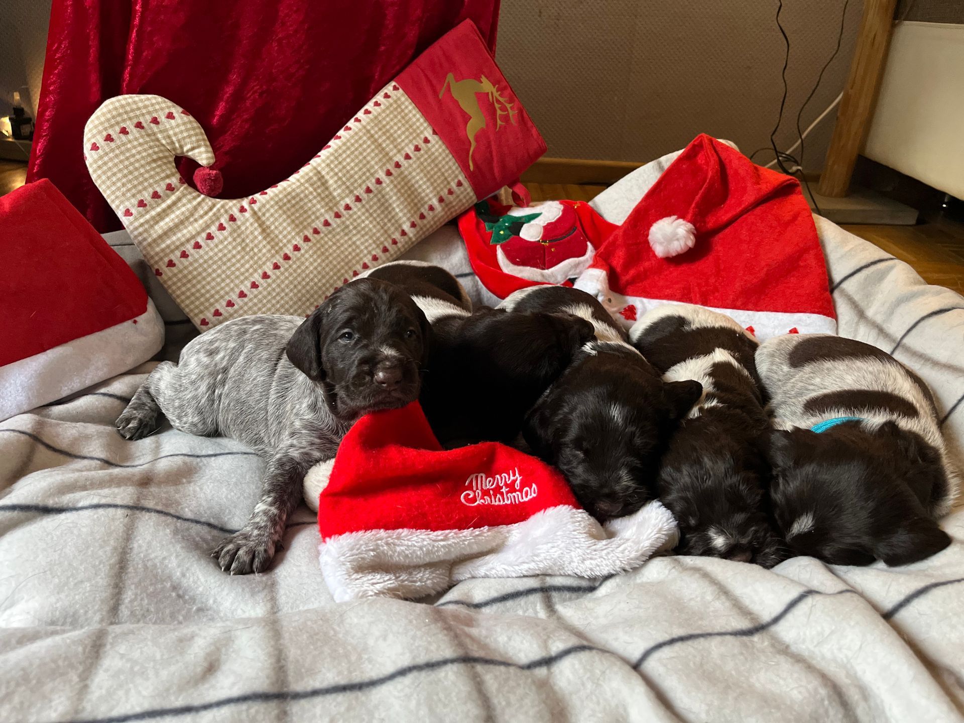 Heiligabend waren die 5 genau 3 Wochen alt. An den Weihnachtsfeiertagen sind sie dann in Ihren Zwinger ausgezogen wo sie schnell mobiler geworden sind.